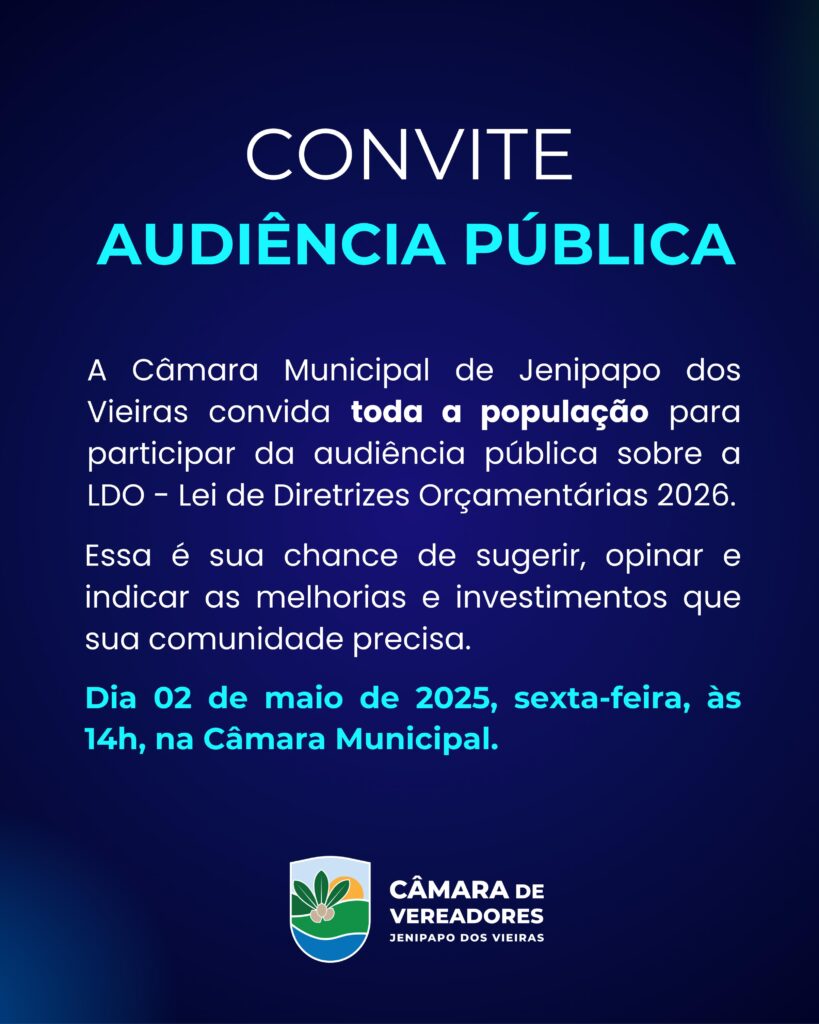 A Câmara Municipal de Jenipapo dos Vieiras convida toda a população para participar da Audiência Pública sobre a Lei de Diretrizes Orçamentárias (LDO) 2026. Data: 02 de maioHorário: 14hLocal: Câmara…